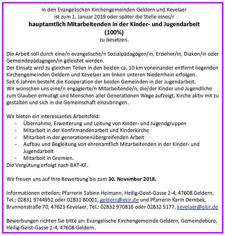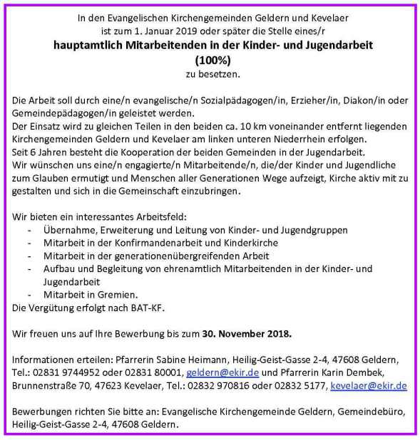 Jugendliche, die zwischen dem 1. August 2004 und dem 31. August 2005 geboren sind, haben das Alter erreicht, um in der Ev. Kirchengemeinde Geldern am Konfirmandenunterricht teilzunehmen. Selbstverständlich können auch Jugendliche angemeldet werden, die noch nicht getauft sind.