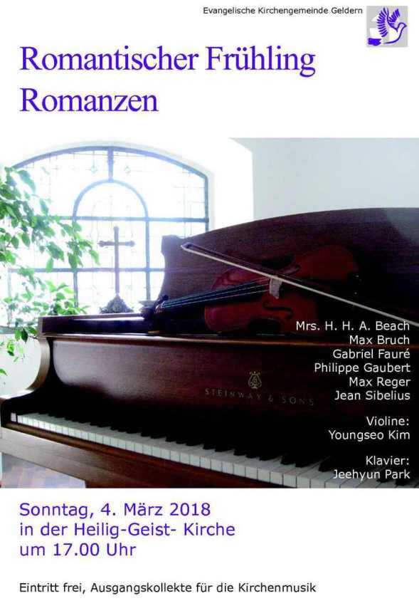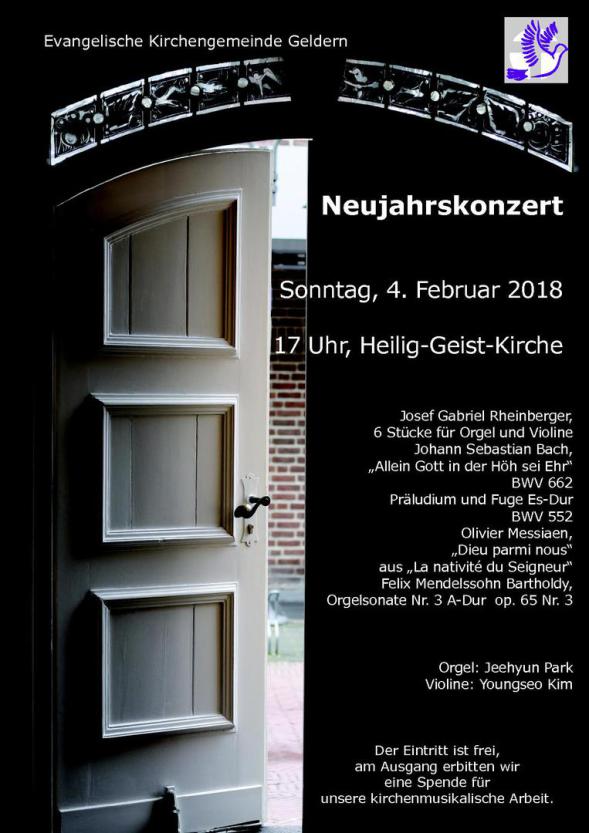 Neujahrskonzert in der Heilig-Geist-Kirche heute am späteren Nachmittag mit Werken verschiedener Komponisten unterschiedlicher Zeiten und Stilrichtungen für Orgel und Violine: Bach, Messiaen, Rheinberger und Mendelssohn Bartholdy. Kontrast- oder ergänzendes Programm zu den karnevalistischen Veranstaltungen des Tages.