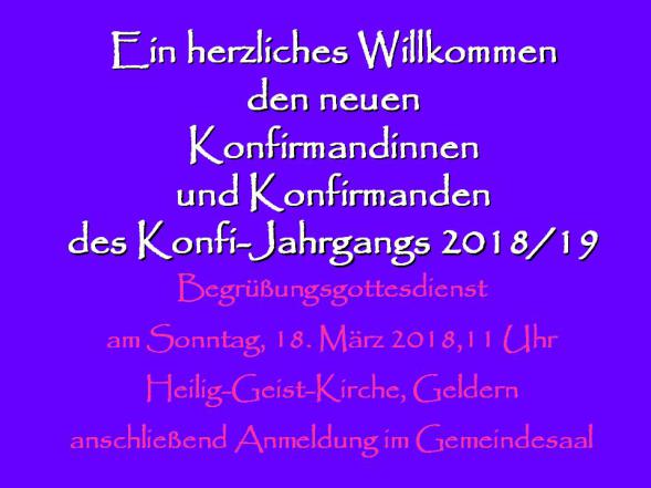 Die Anmeldung des Konfirmandenjahrgangs 2018/19 erfolgt im Anschluss an den Begrüßungsottesdienst am Sonntag, den 18. März 2018. Der Gottesdienst beginnt um 11 Uhr.