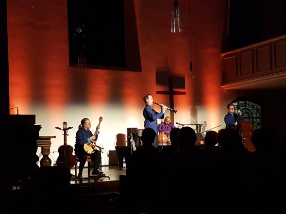 Nach der Pause begeisterte Devan, der tamilische Meistertrommler aus Sri Lanka das Publikum mit einem Trommelsolo. Das Publikum ließ sich auf die zeitweisen geforderten Klatschrhythmen ein. Das Programm so flüssig und kurzweilig mit Klarinette und Baßklarinette(Reinald Noisten), Gitarre und Bouzouki(Claus Schmidt), Tabla und anderen Schlaginstrumenten(Shan Devan) und Kontrabass und Ukulele(Andreas Kneip) instrumentalisiert, ließ staunen, dass kurz nach 20 Uhr schon zwei Stunden vergangen waren mit dieser abwechslungsreichen Vorstellung.