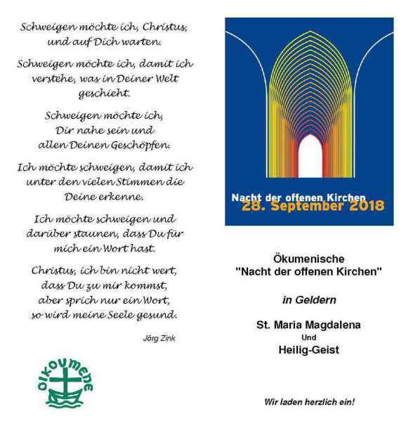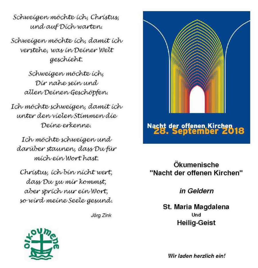 Am Donnerstag, 8. November lädt die Evangelische Kirchengemeinde Geldern um 18 Uhr zu einem Widerstandsgebet für Menschlichkeit, Demokratie und Verständigung in der Heilig-Geist- Kirche ein.