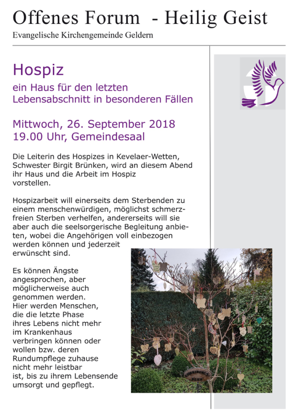 Hospiz – Ein Haus für den letzten Lebensabschnitt in besonderen Fällen. Zu diesem Thema lädt die Evangelische Kirchengemeinde Geldern ein am Mittwoch, 26. September 2018 um 19 Uhr in den Gemeindesaal des Gemeindezentrums, Heilig-Geist-Gasse 2-4, Geldern.