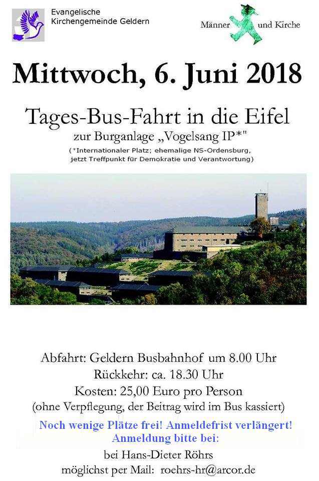 Abfahrt der Fahrt ist um 18.15 Uhr ab Busbahnhof Geldern. Karten inklusive Bustransfer von 30 Euro/34 Euro erhältlich nach Anmeldung bis zum 7. Februar 2018 bei U. Edelkraut, Tel. 02831 6403 oder Mail: geldern@ekir.de