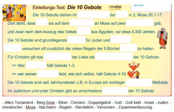 Eines der bereits zugeschickten Arbeitsblätter beschreibt die 10 Gebote in heutiger Sprache. Und auf der Rückseite dieses Arbeitsblattes habt ihr die Aufgabe bekommen zu übelegen, welche Gebote es noch zu den 10 Geboten geben könnte bzw. sollte, weil die 10 Gebote nicht alle Fragen umfassen, die uns heute beschäftigen. So kommen das Verhältnis zur Umwelt, die Einstellung zu Ausländern, der Umgang mit Medien oder Fragen des Tierschutzes nicht direkt vor.